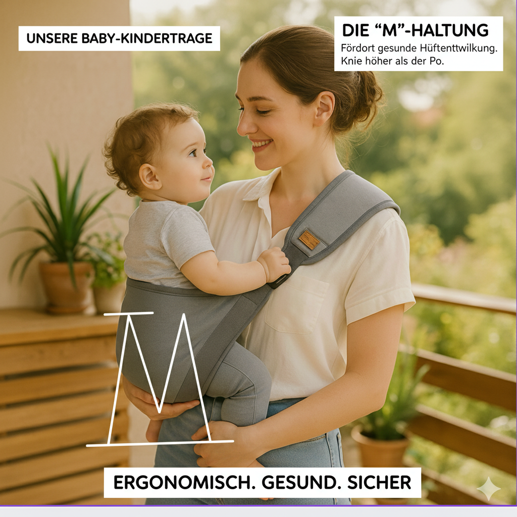 Beim Tragen ist die richtige Haltung entscheidend: In der sogenannten M-Haltung sind die Beine deines Babys leicht gespreizt und die Knie höher als der Po – so, dass sich die Beinchen in Form eines „M“ befinden. Diese Position unterstützt die gesunde Entwicklung der Hüftgelenke und beugt Fehlstellungen vor. Unsere Trage fördert diese natürliche Haltung automatisch, sodass du dein Baby immer ergonomisch korrekt und sicher tragen kannst.